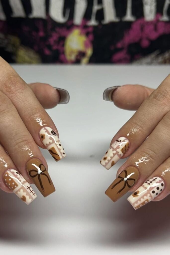 Brown bow charm nails feature small bow designs in warm brown shades. The bows stay simple and neat. This style feels sweet without being childish. It pairs well with soft fabrics and cozy outfits.