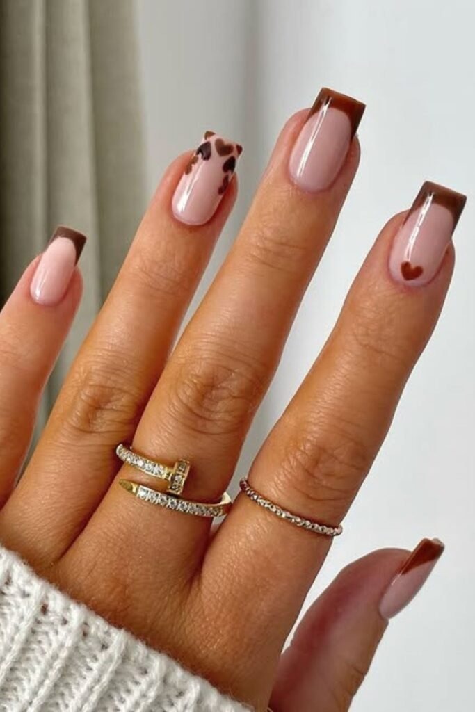 Brown French hearts use heart shapes at the tips instead of classic lines. The brown shade keeps it grounded. The hearts stay small and tidy. This look adds romance without being loud.