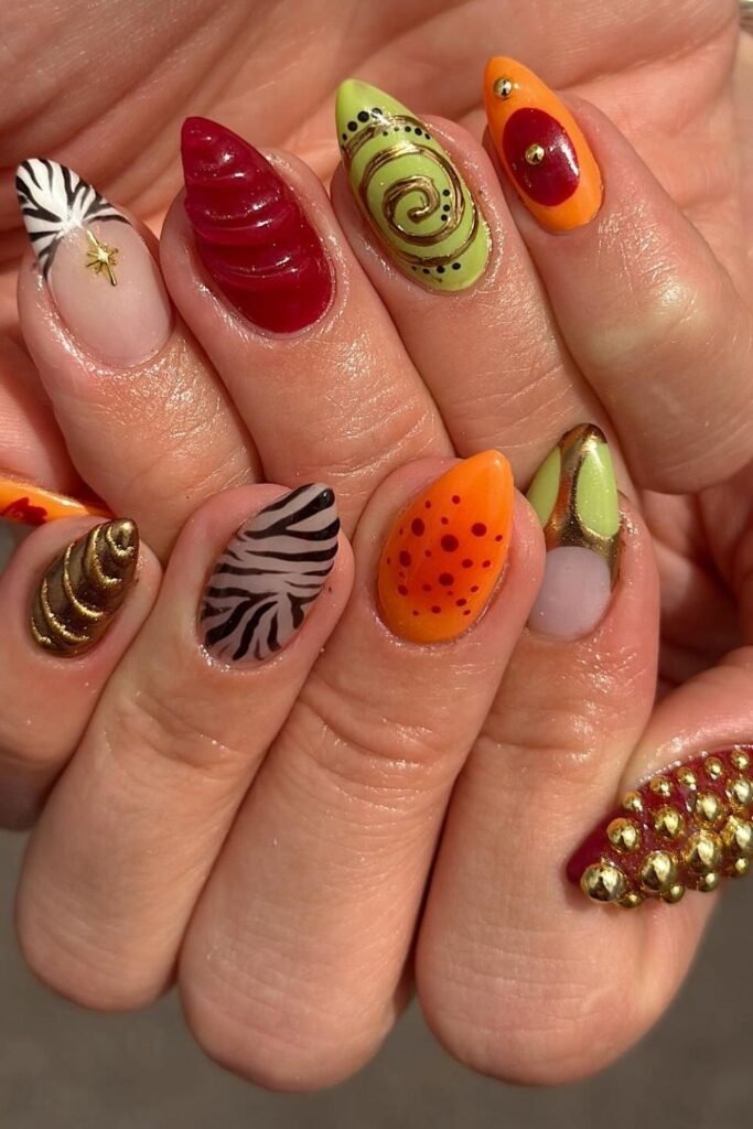 Fall carnival nails mix fun shapes and warm colors in a balanced way. The designs stay simple, avoiding clutter. This style feels joyful but still seasonal. It suits creative personalities.
