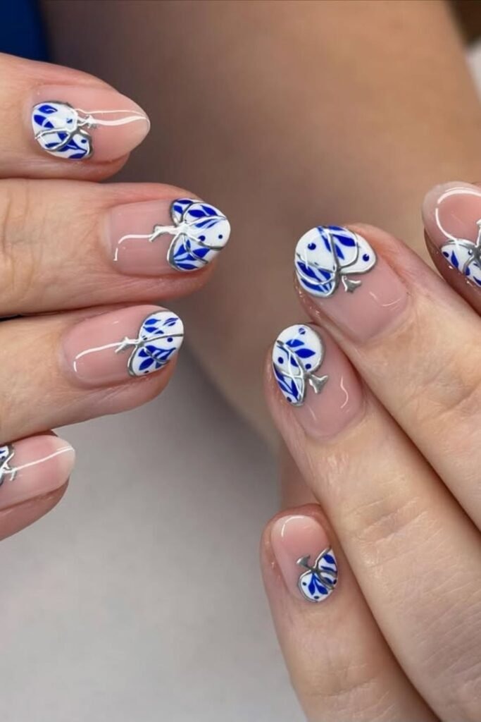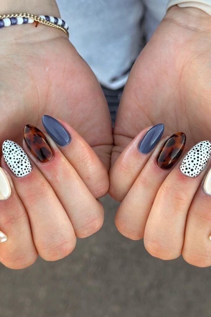 Blue tortoise mix nails combine muted blue with classic tortoise patterns. The colors stay soft and balanced. This design feels fresh while still fitting fall. It works well for those who want something different but safe.