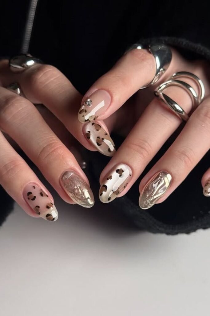 Golden glazed leopard nails use soft leopard spots with a glossy gold finish. The gold stays warm, not bright. This design feels rich and calm, perfect for fall evenings.