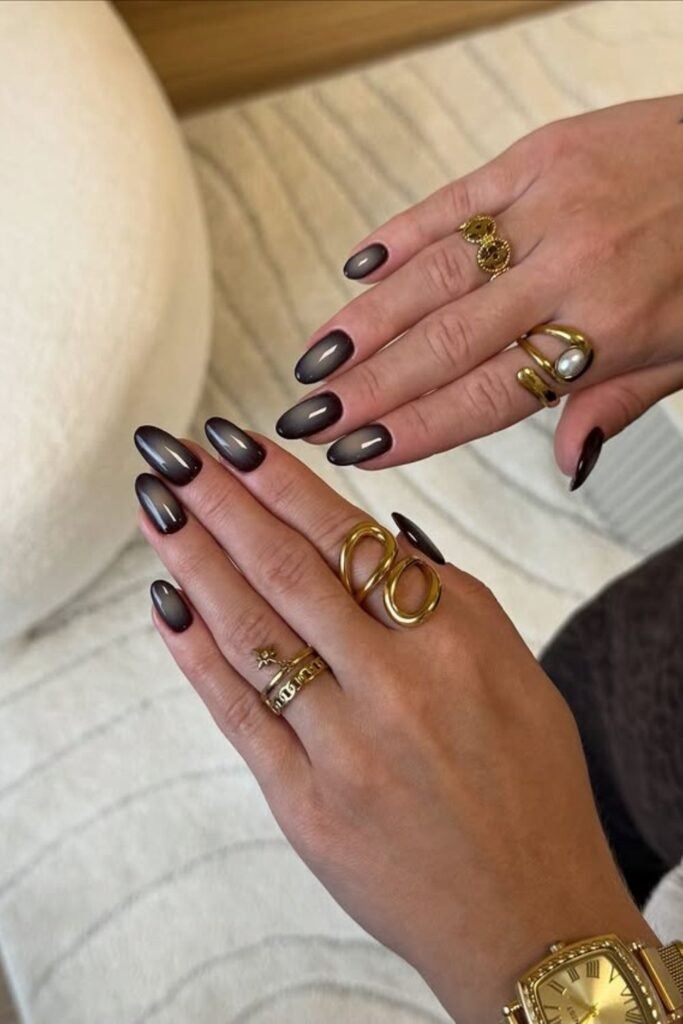 Brown chrome fade nails blend brown polish into soft chrome shine. The fade stays smooth and gentle. This style feels modern and wearable. It also hides wear well.