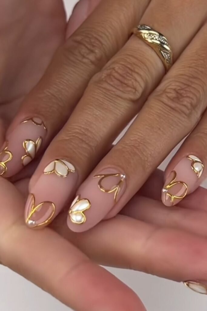 Gold outline hearts use thin gold lines to shape hearts on neutral bases. The design feels light and thoughtful. It works well for fall events and daily wear alike.