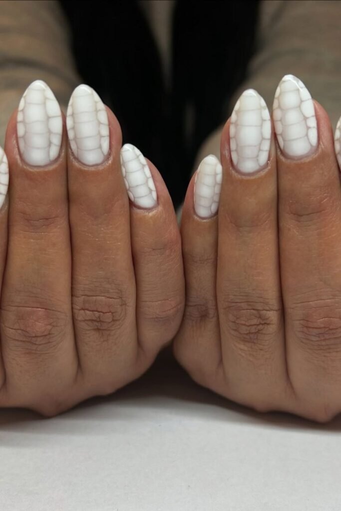 White croc texture nails use soft white polish with a raised pattern. The texture adds depth while the color keeps it clean. This style balances fall warmth with freshness.
