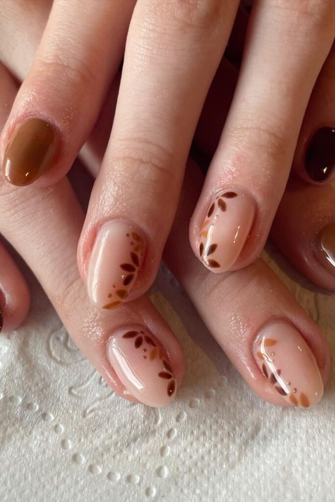 Autumn accent mix nails focus on one detailed nail while others stay plain. The accent nail may have leaf art, gold lines, or texture. This style keeps things simple and stylish. It also makes nail upkeep easier.