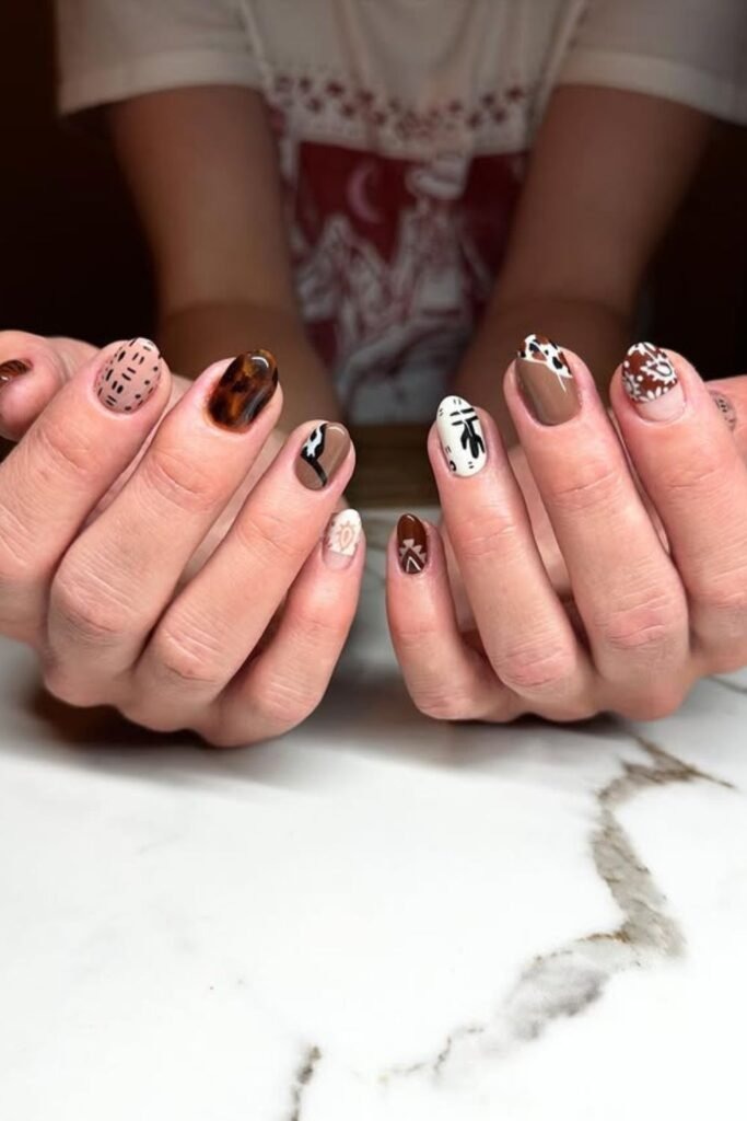 Brown marble mix nails blend light and dark brown shades in soft marble patterns. The look feels smooth and natural. Each nail looks unique, adding interest without chaos.