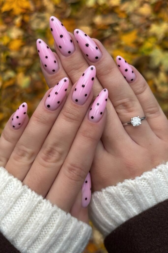 Pink polka whimsy nails use muted pink shades with small dots. The look feels light and cheerful. It adds softness to fall palettes without clashing.