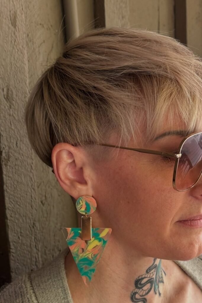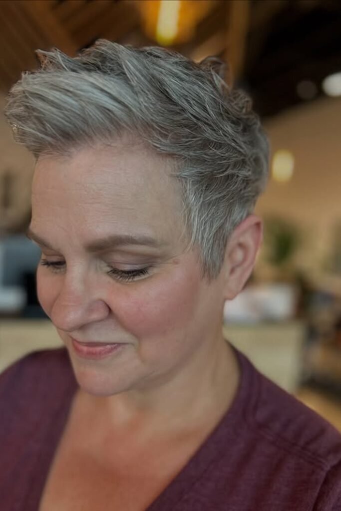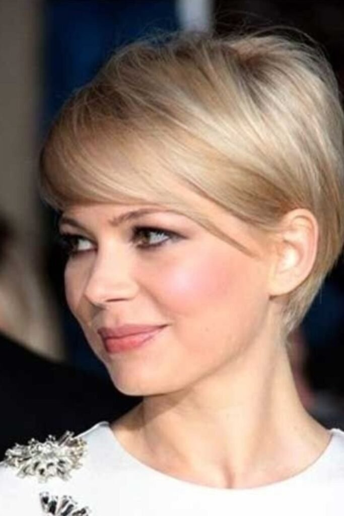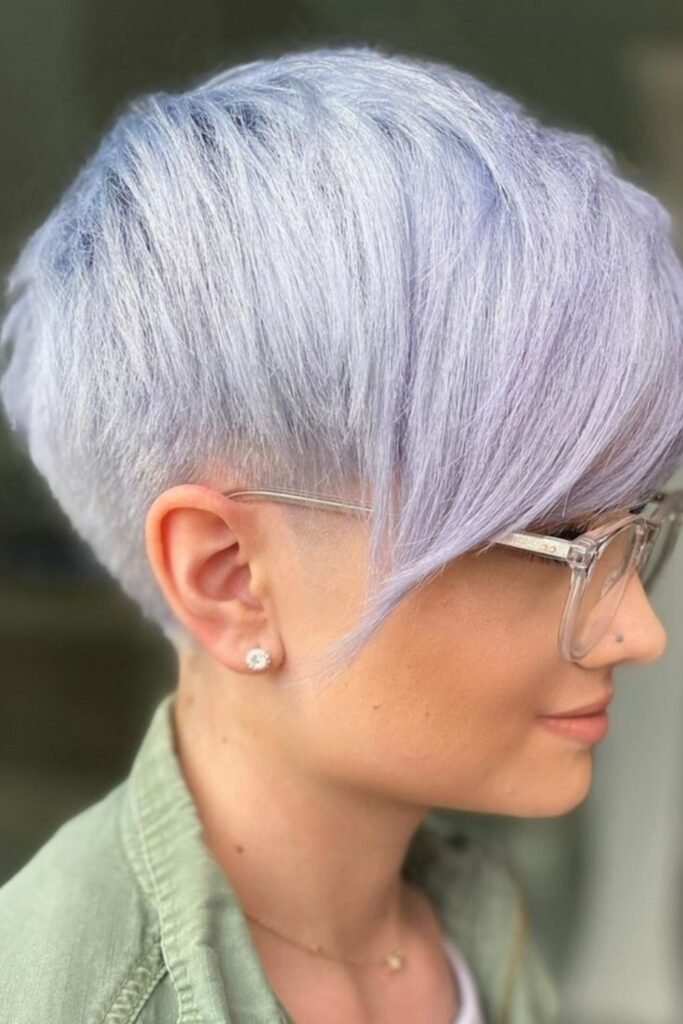 Side-swept pixies with platinum highlights elevate the hair visually. Fine hair appears fuller when the top is slightly longer and swept to one side. Color adds depth, and subtle layering prevents the hair from appearing thin or flat.