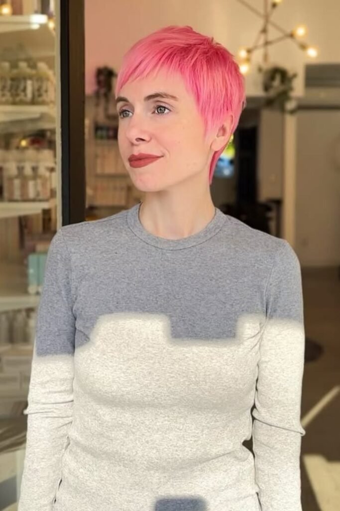 In 2026, soft fashion colors like candy pink add personality to a pixie cut. Fine hair benefits from this playful approach, as the short length shows off the color while the layers maintain texture. Subtle styling with mousse or light pomade ensures volume without weighing hair down.