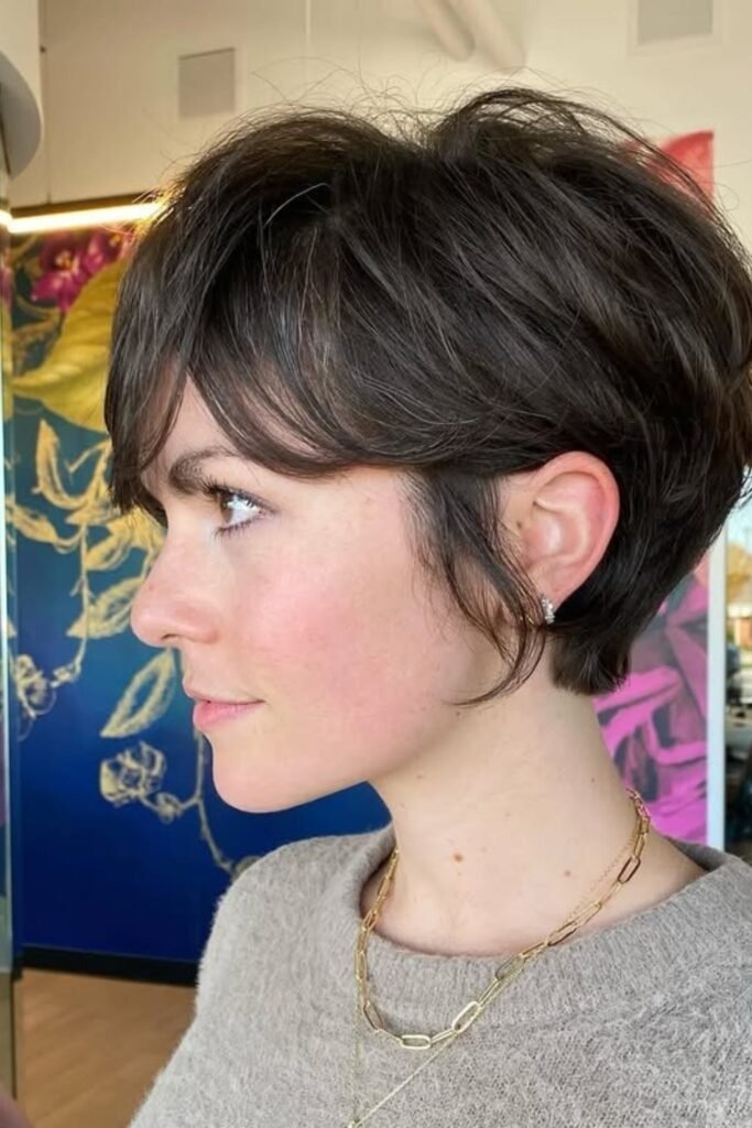 Feathered fringe pixies combine short layers with soft, feathered edges around the forehead. This approach reduces bulk while creating gentle lift at the roots. Fine hair appears thicker and more textured without heavy styling products, making it ideal for low-maintenance styling.
