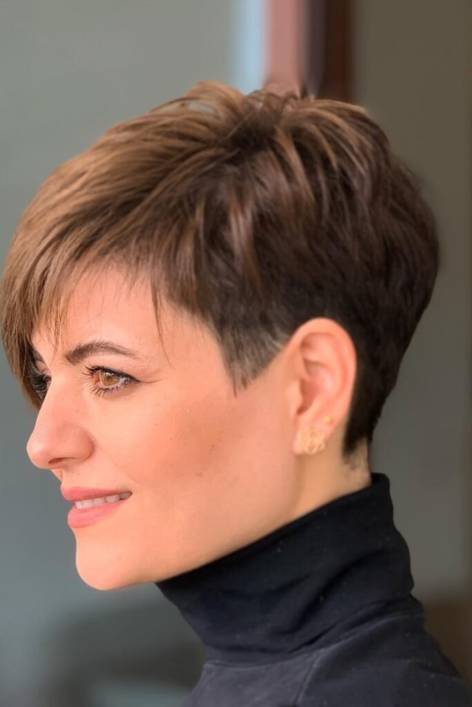 A tousled crown pixie emphasizes movement at the crown. Layers are cut strategically to allow hair to fall naturally while maintaining volume. Slightly longer strands on top can be styled with a light mousse to prevent flatness. This cut is ideal for casual and professional settings alike.