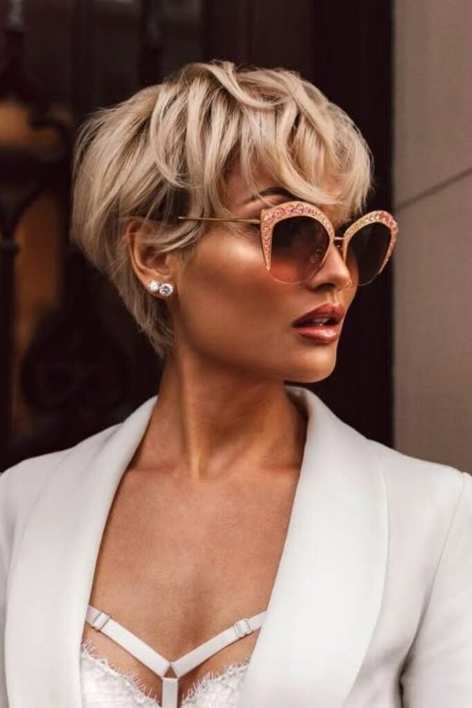 Glam tousled pixies use short layers and soft tousling to create natural lift. Fine hair is enhanced with gentle waves and light styling products. This approach keeps hair lively while maintaining elegance and versatility.