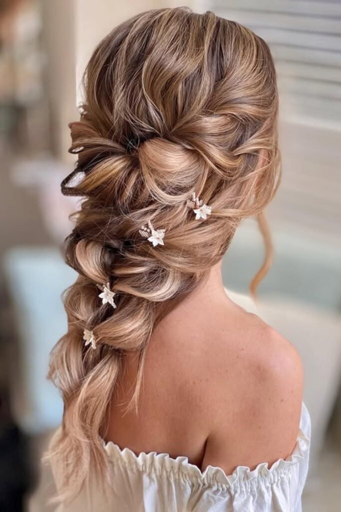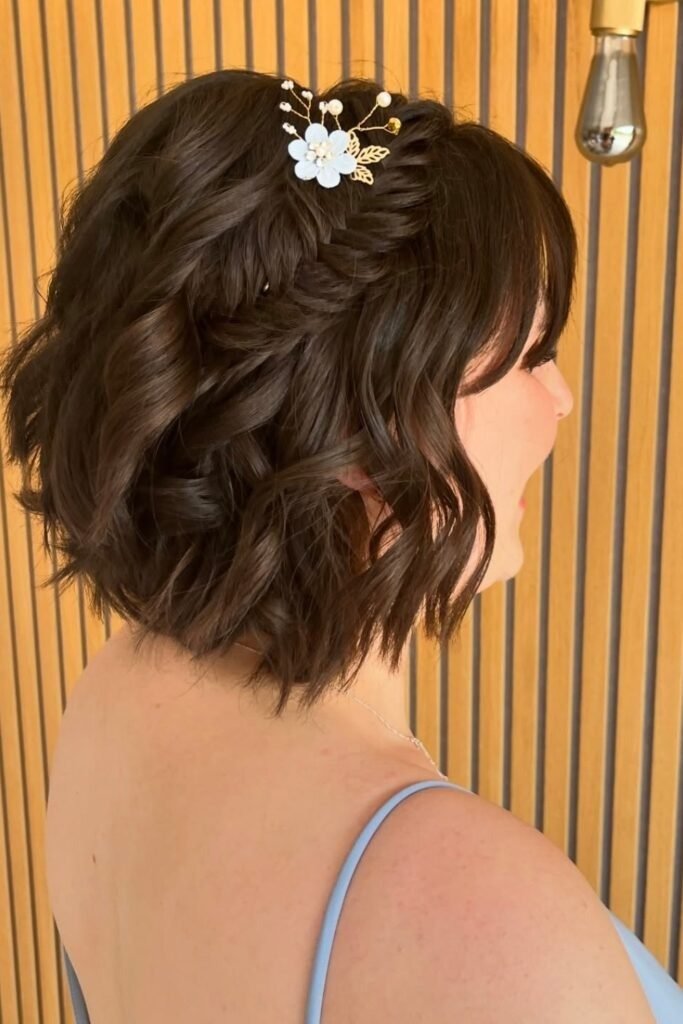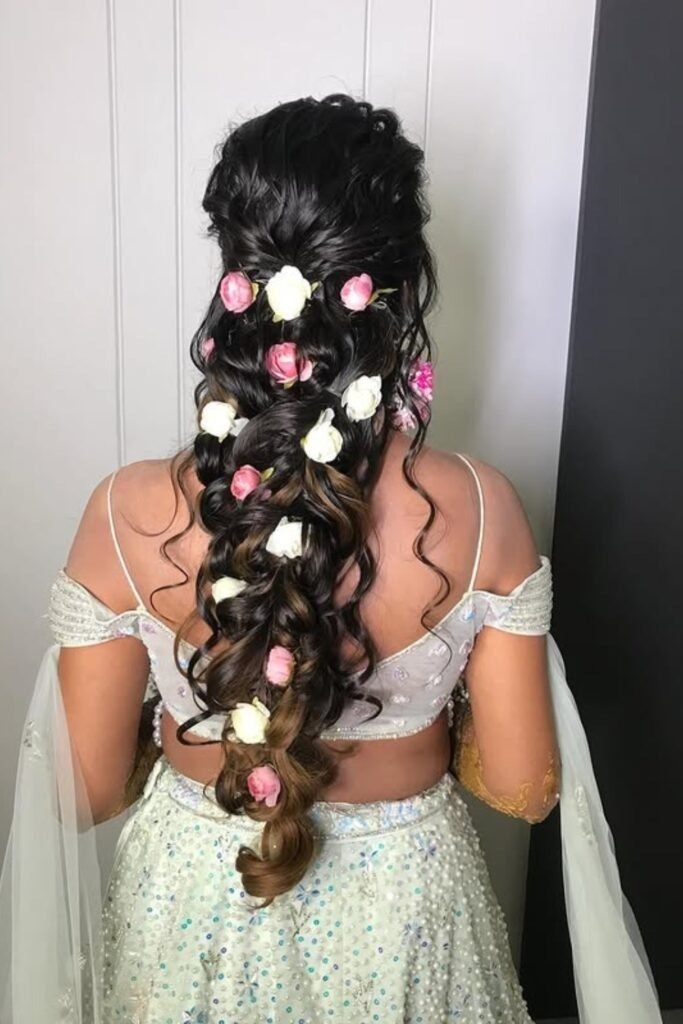 The braid starts at one side and falls over the shoulder. Floral pins are added along the braid. This placement keeps the braid visible and frames the face softly. It works well with layered hair and adds balance to round and oval face shapes.
