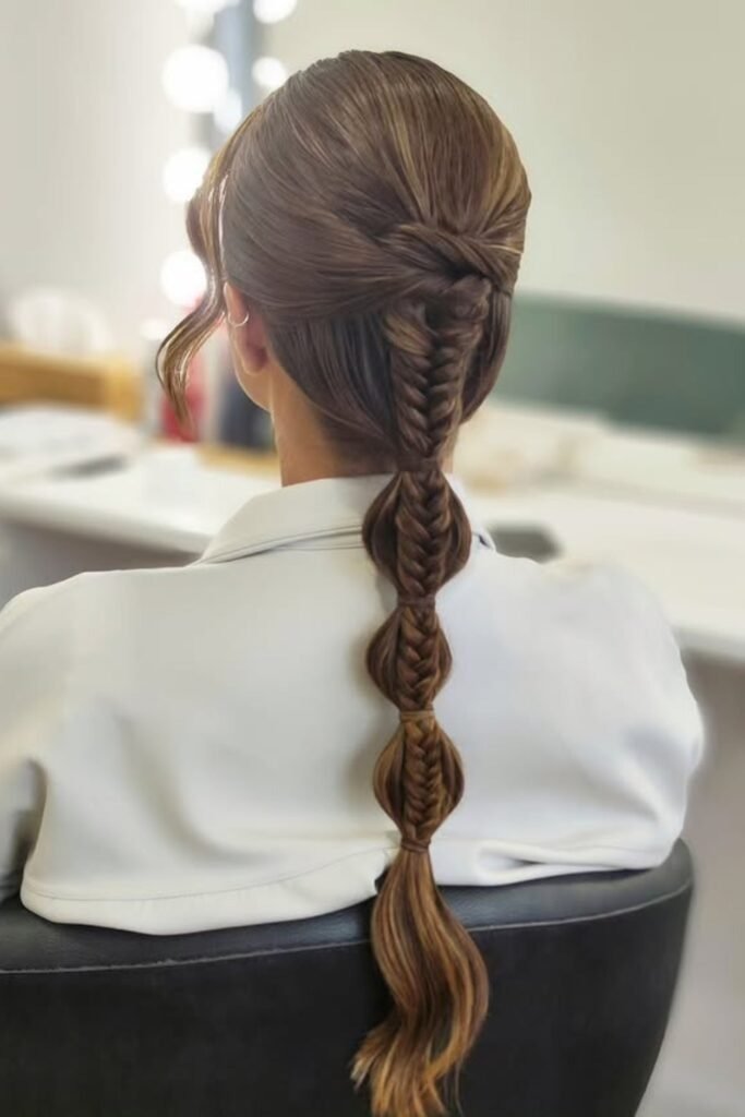 This style starts as a fishtail braid and then shifts into bubble sections down the ponytail. Hair ties are spaced evenly and the hair is gently pulled out between them. The fishtail at the top keeps the base strong. The bubbles add shape and fun to the length.