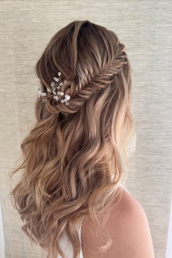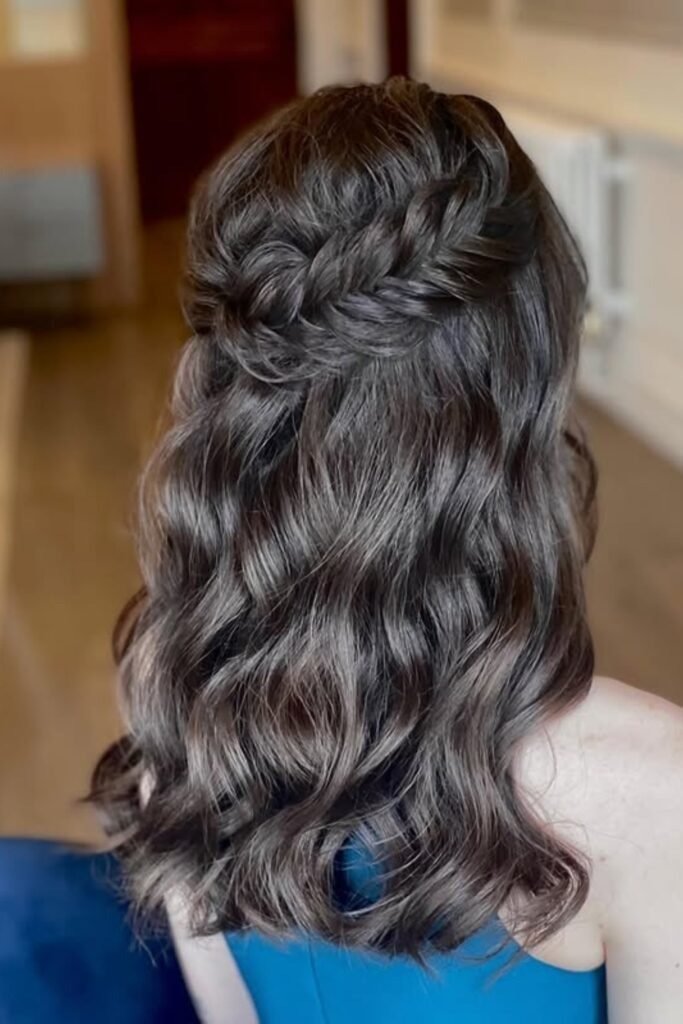 This style mixes loose hair with structure. The top section of the hair is braided into a fishtail, while the rest of the hair flows down in soft waves. The braid adds shape at the crown and keeps hair away from the face. The waves add movement and keep the style light. This look works well for long days and casual events.