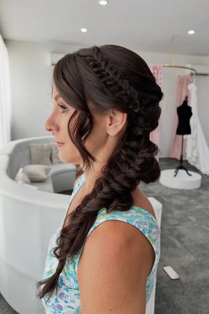 In this style, only one side of the hair is braided into a fishtail and pinned back. The rest of the hair stays loose. This keeps the face open and adds interest without full braiding. It is easy to wear and quick to style.