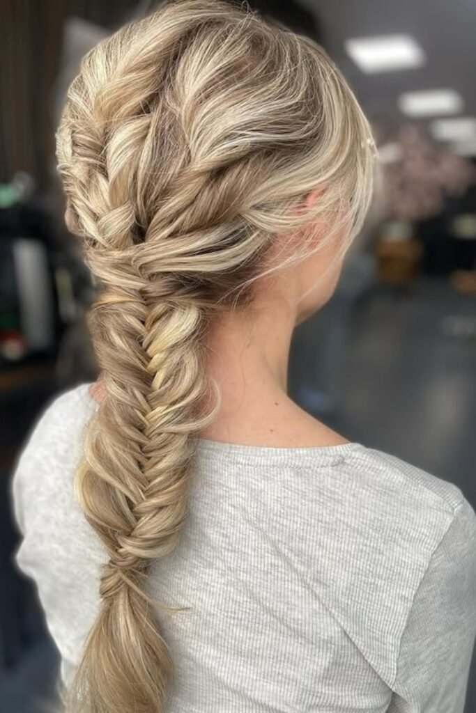 This braid blends the fishtail method with Dutch placement. The braid sits on top of the hair instead of blending in. It is gently pulled apart to add volume. This style gives lift at the scalp and looks strong without being heavy.