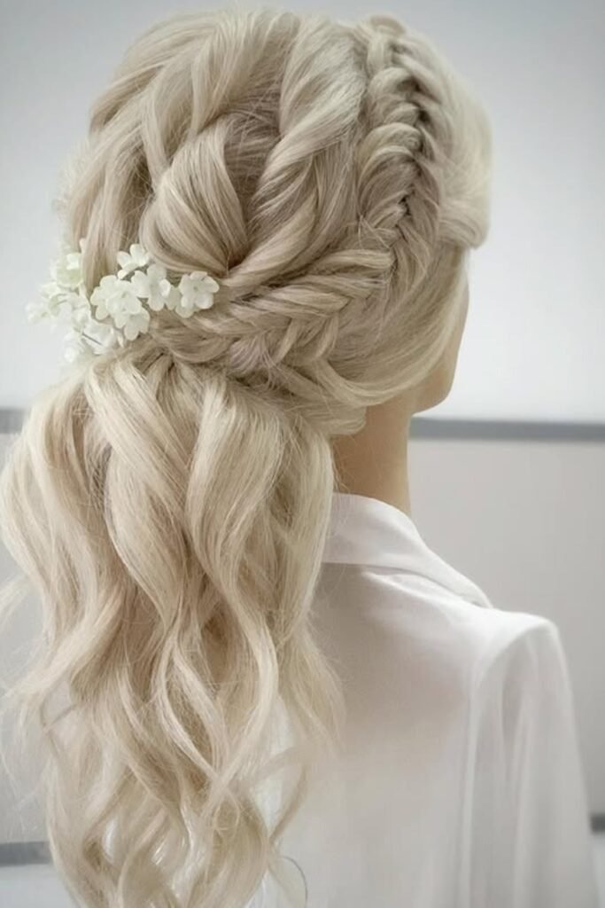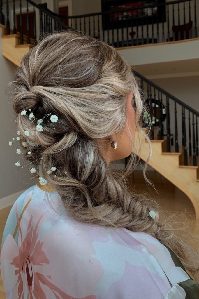 This fishtail braid is styled with soft volume and finished with floral accents. The flowers are placed between braid sections, not forced in. This keeps the braid secure and balanced. It is a strong choice for weddings or formal events where you want detail without weight.