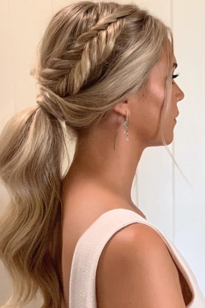 This style is smooth and controlled. The hair is pulled into a low or mid ponytail and braided into a fishtail. The surface stays sleek with no loose strands. This look holds well and works for long days when you need your hair secure.