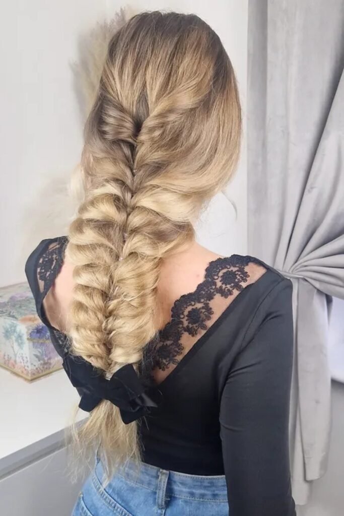The loose boho fishtail is wide and soft. Strands are pulled out gently. The braid feels relaxed and natural. This is one of the most worn fishtail styles in 2026 because it suits many hair types.