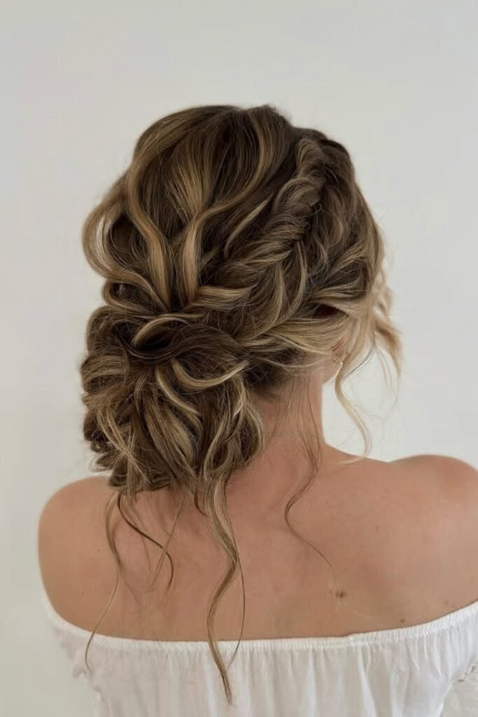 This look combines fishtail braiding with loose twists. Small twisted sections feed into the braid. The result feels relaxed and textured. It works best on wavy or slightly messy hair and suits outdoor events and casual wear.