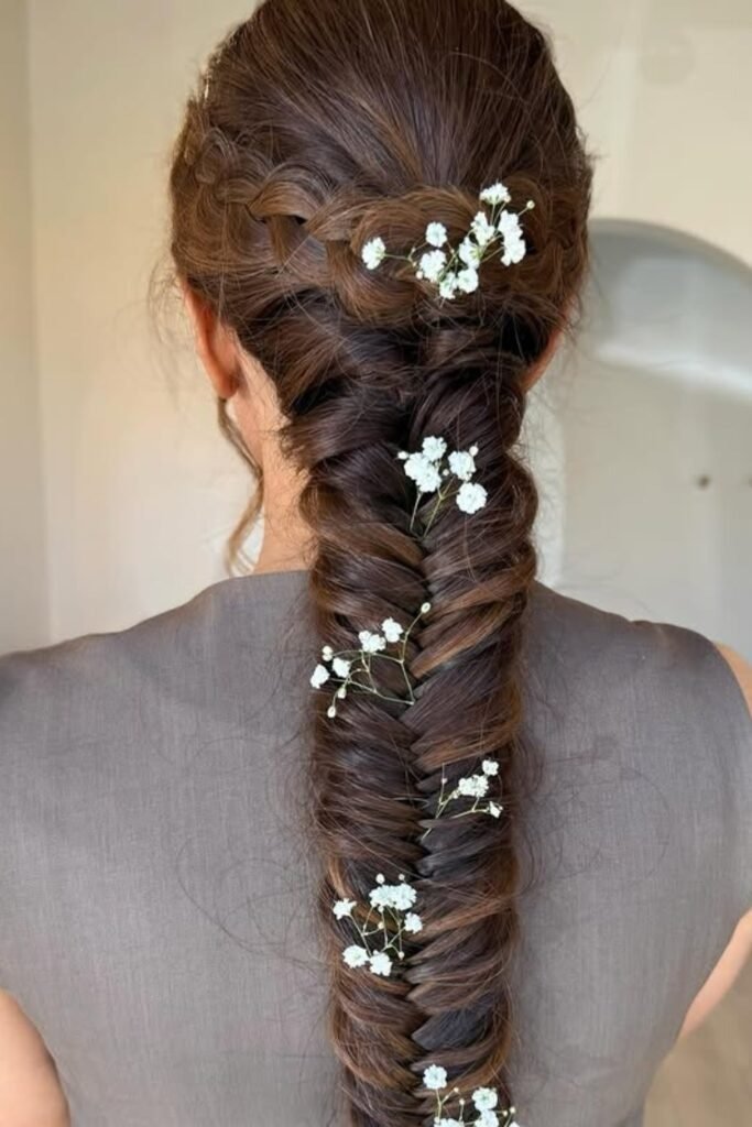 This style uses small braids woven into the main fishtail. Floral accents are placed between sections. The braid looks full and detailed without feeling heavy. It works best on long hair.