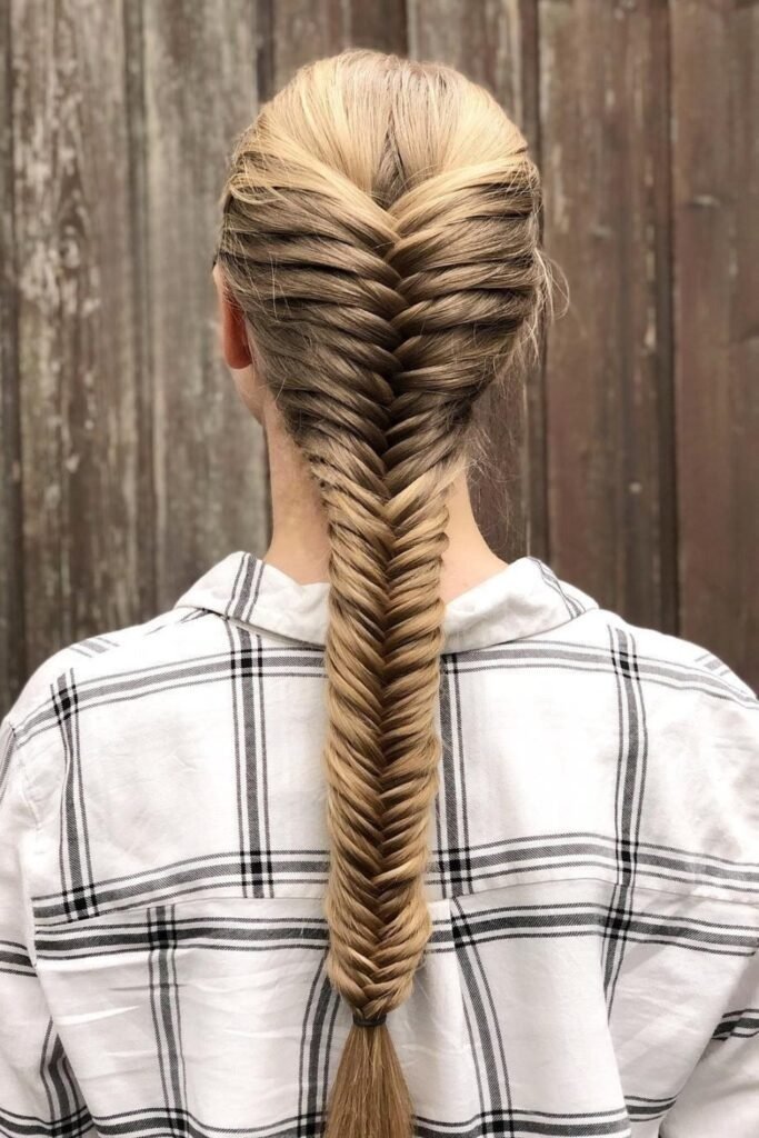 This is the clean version of the fishtail braid. The sections are small and tight. The braid stays narrow and firm. This style lasts all day and works well for neat looks.