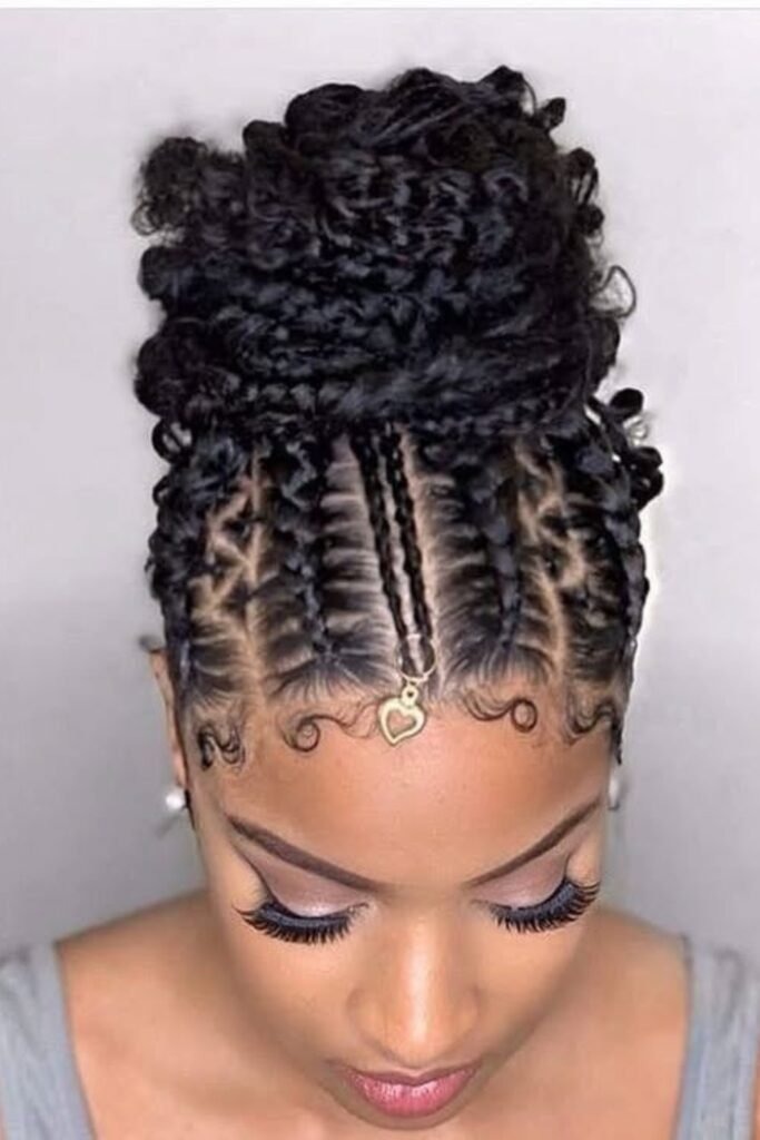 The braided top knot goddess style brings focus upward. The braids are pulled into a knot on top of the head, while curls are left free or tucked in softly.