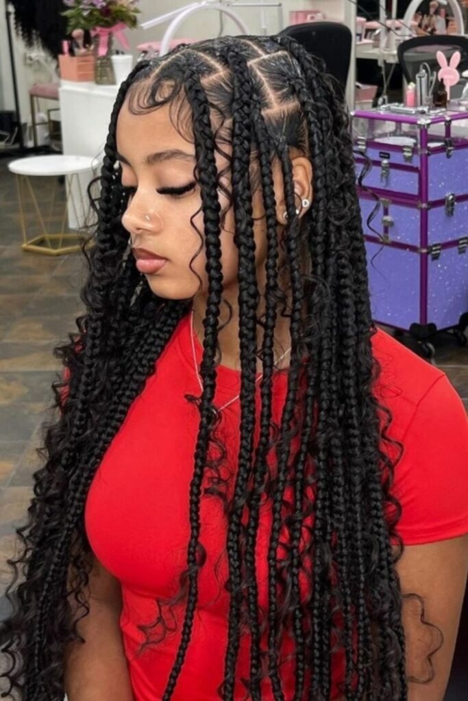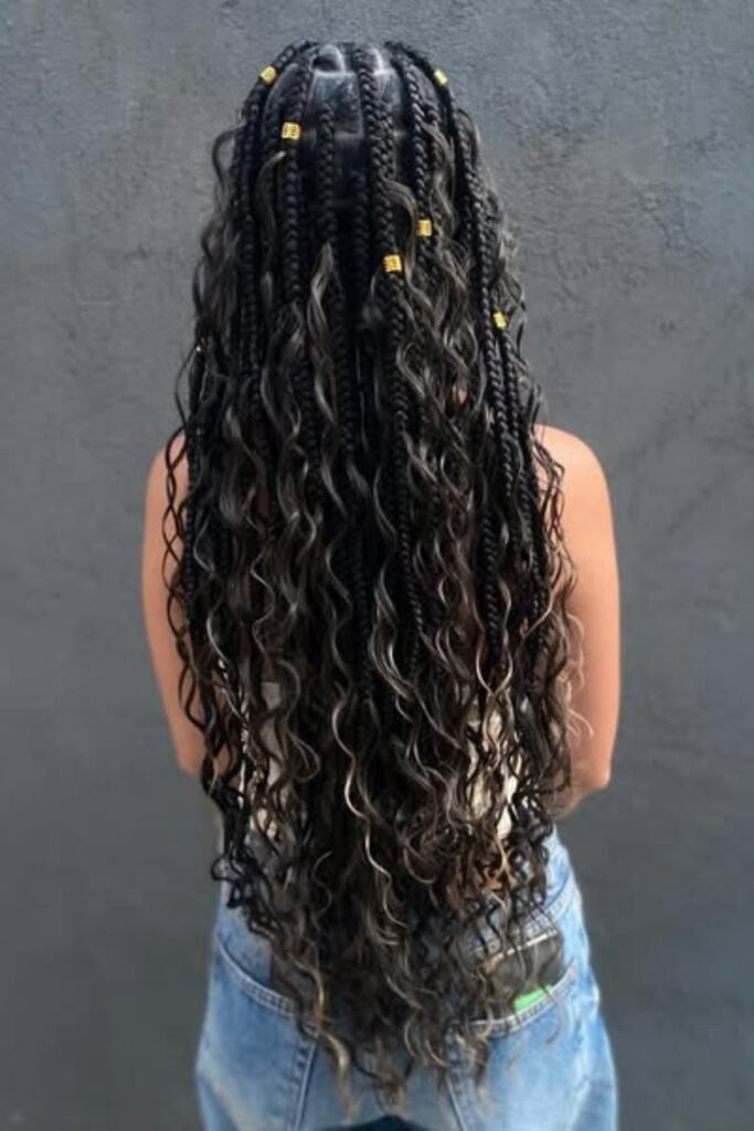 Long boho flow goddess braids are all about length and movement. The braids fall down the back with loose curls flowing freely. This style feels natural and full of life.