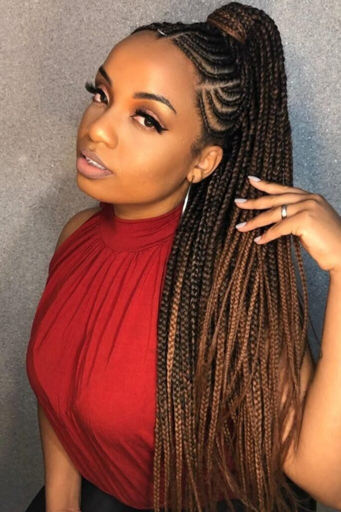 Side-swept cornrow pony goddess braids bring a modern twist. The braids are done as cornrows that move to one side and join into a ponytail. Curls flow from the pony.
