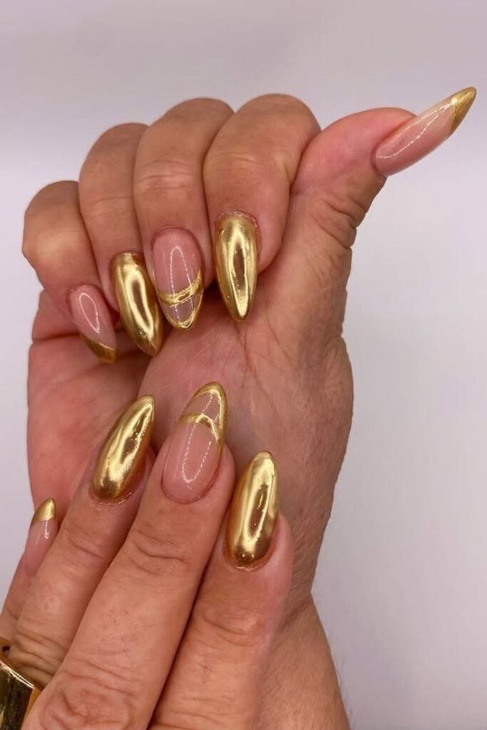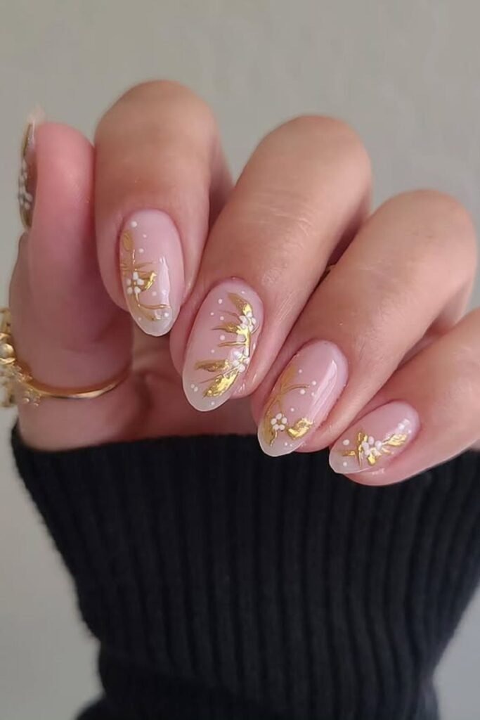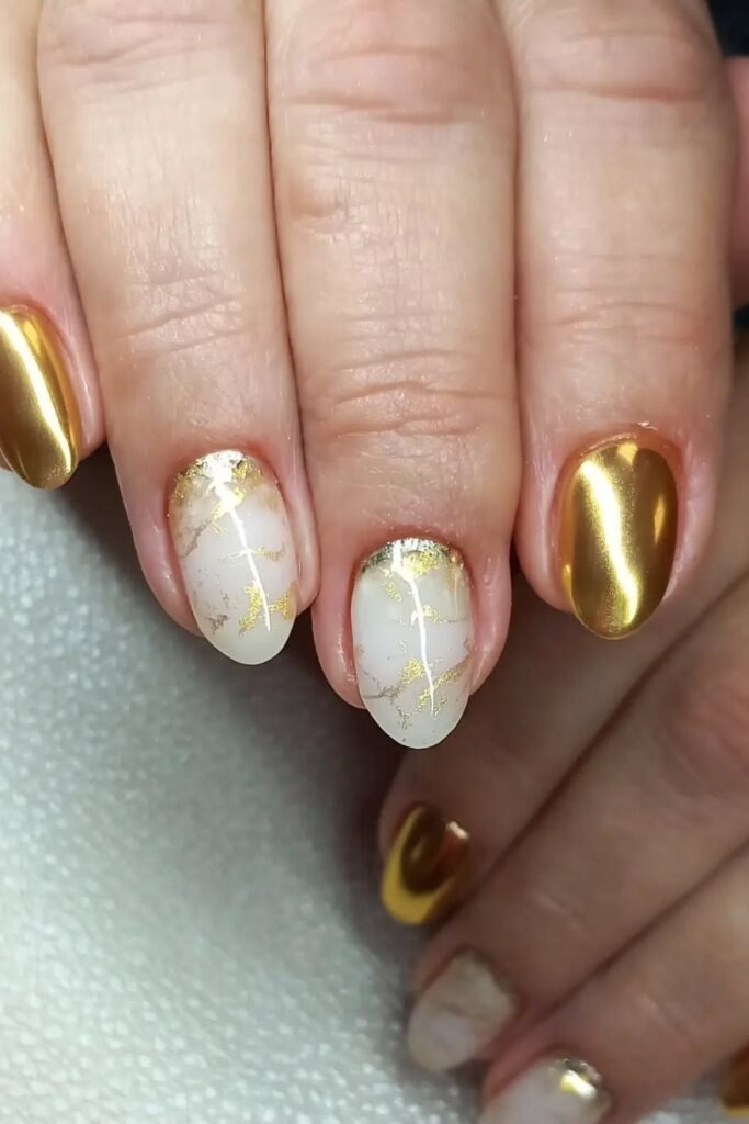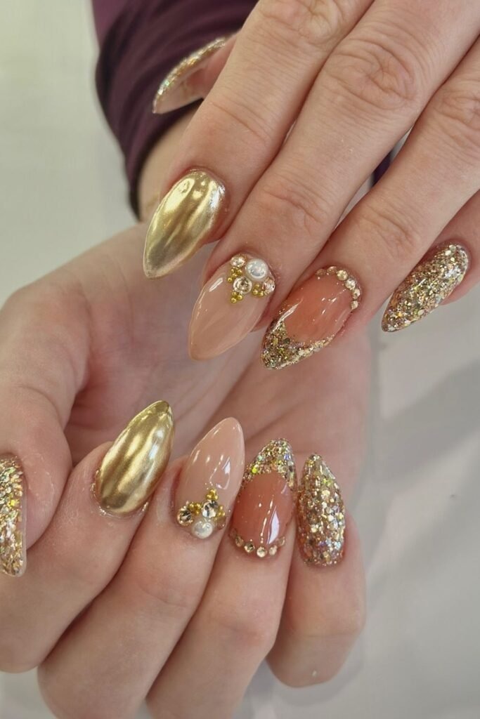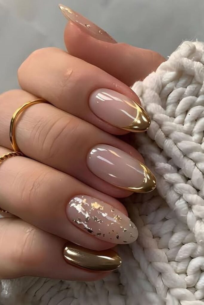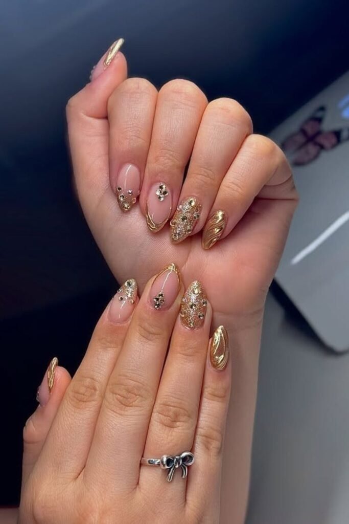 This style mixes gold with soft neutral colors. Some nails may have gold accents, while others stay plain. The mix keeps the set interesting without feeling busy. It works best when the gold is placed carefully, not randomly. This look fits people who like variety but still want control.