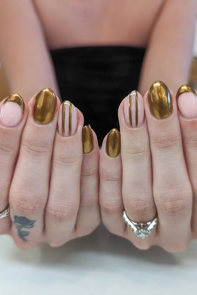 Mixed gold accents use gold in different small ways across the set. One nail may have lines, another foil, another tip. The mix works only when the base color stays the same. This keeps the look connected and clean.