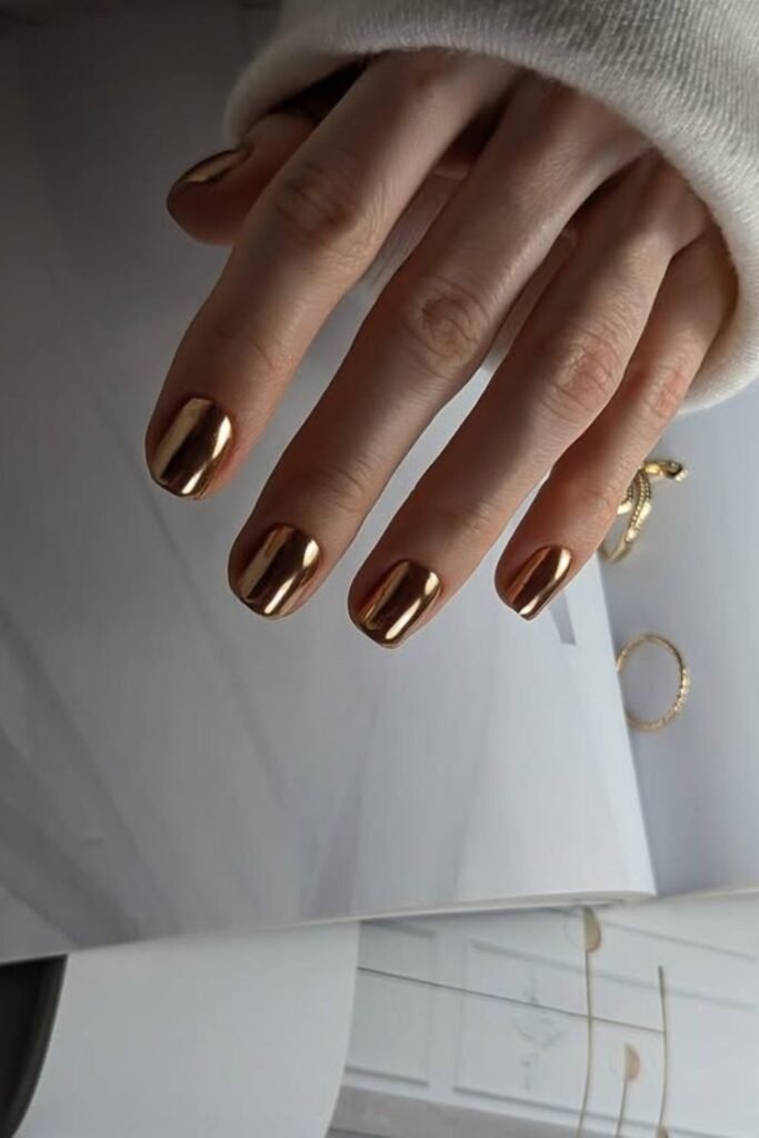 Bronze mirror glow sits between gold and brown. It feels warm and deep. This design works best in fall and winter. The mirror finish gives shine without sparkle. It looks strong but not loud. Short nails look especially good with this tone.