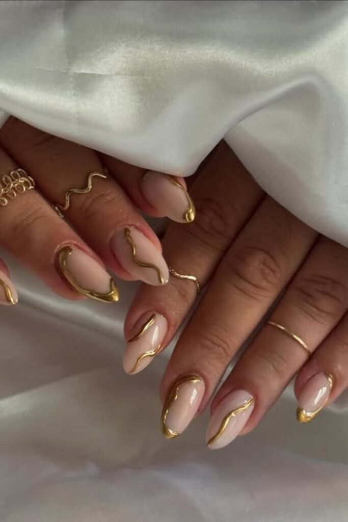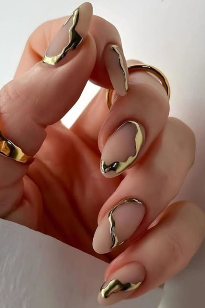 Abstract gold lava uses free-flowing gold shapes that look natural. The design does not follow rules, but it stays balanced. This style feels artistic and modern. It works best on neutral bases so the gold remains the focus.