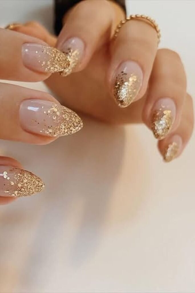 Glitter gold fade blends fine glitter into a clear or nude base. The fade keeps the glitter soft. This design feels light and playful. It works well for celebrations without looking heavy.