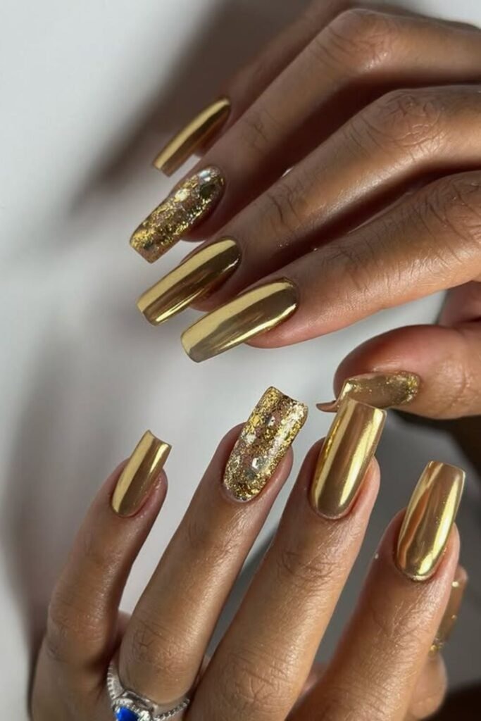Gold chrome ombre blends gold with nude or clear in a smooth way. The chrome finish adds light, but the ombre keeps it calm. This design works best on almond or coffin shapes. It feels modern and smooth, making it a strong choice for trend lovers.