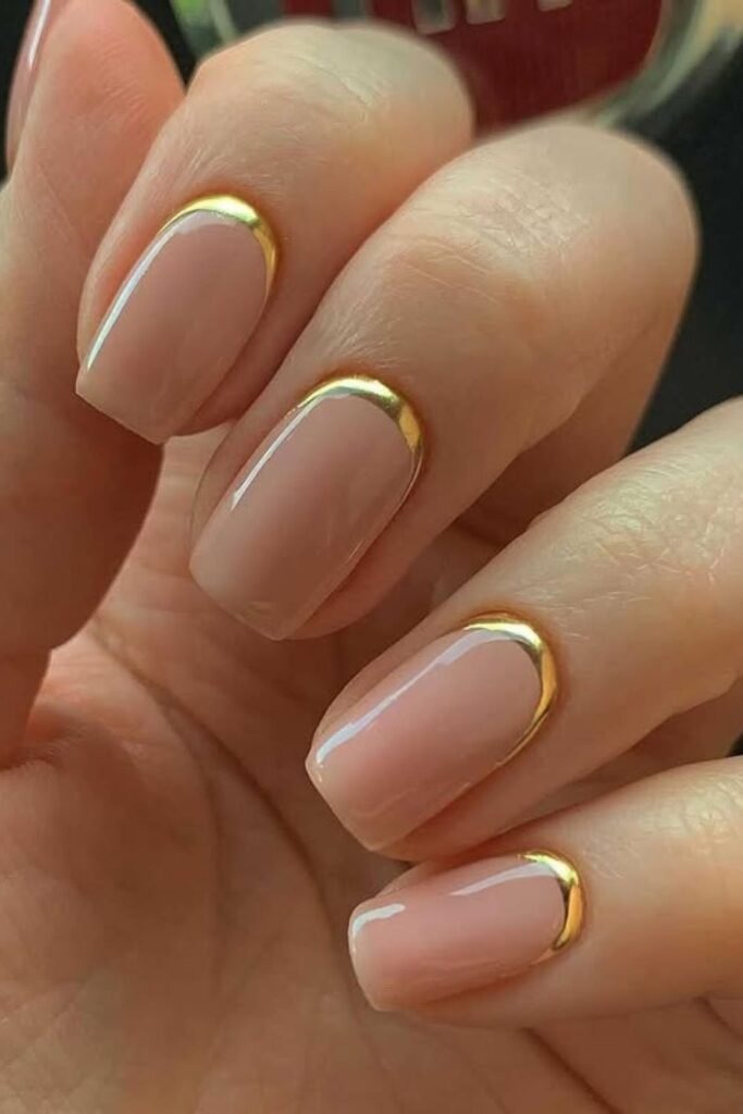 Golden crescent tips place gold in a curved shape near the tip. The curve follows the nail shape. This design feels soft and balanced. It is a good option for people who want something different but still simple.