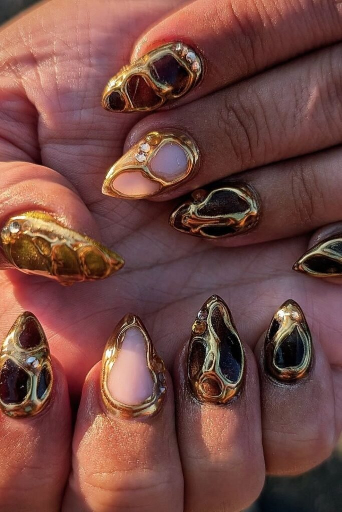 Golden glam luxe uses gold with a rich base color like brown or deep nude. The contrast makes the gold stand out. This style feels dressed up but still clean. It works well for evenings and events without looking overdone.