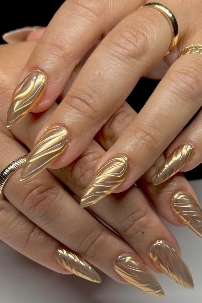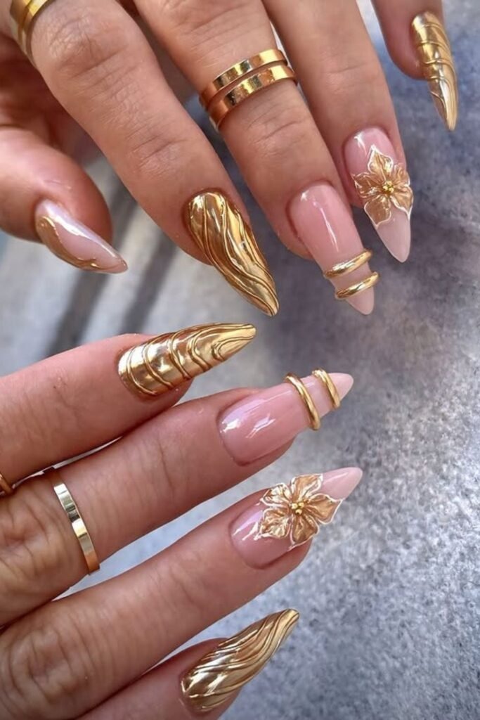 Molten gold sculpt uses thick gold shapes that look melted. The sculpt is smooth and rounded. This style feels bold and artistic. It works best on one or two nails only.