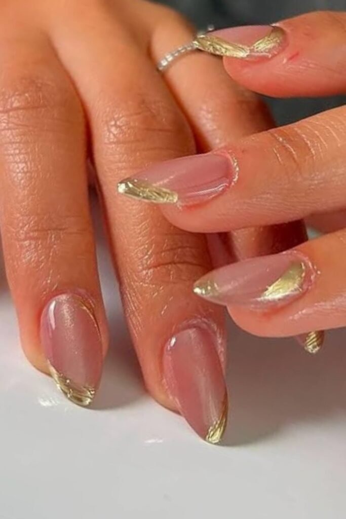Scattered gold foil looks like small pieces placed gently on the nail. The foil should not cover the whole nail. This design feels light and artistic. It works best on clear or milky bases. In 2026, less foil looks better than more.