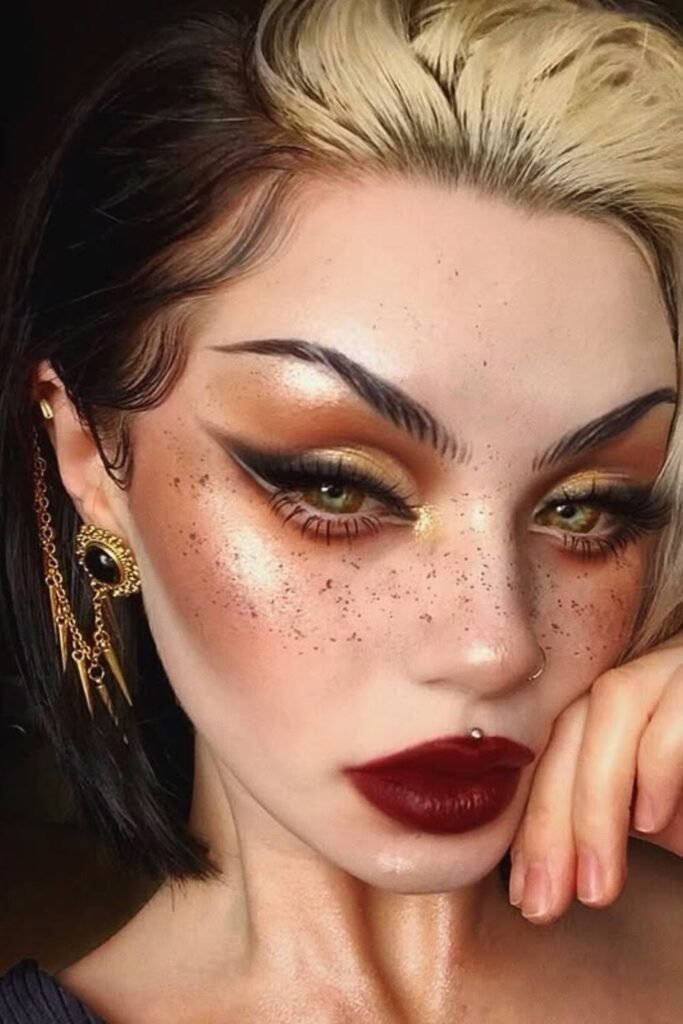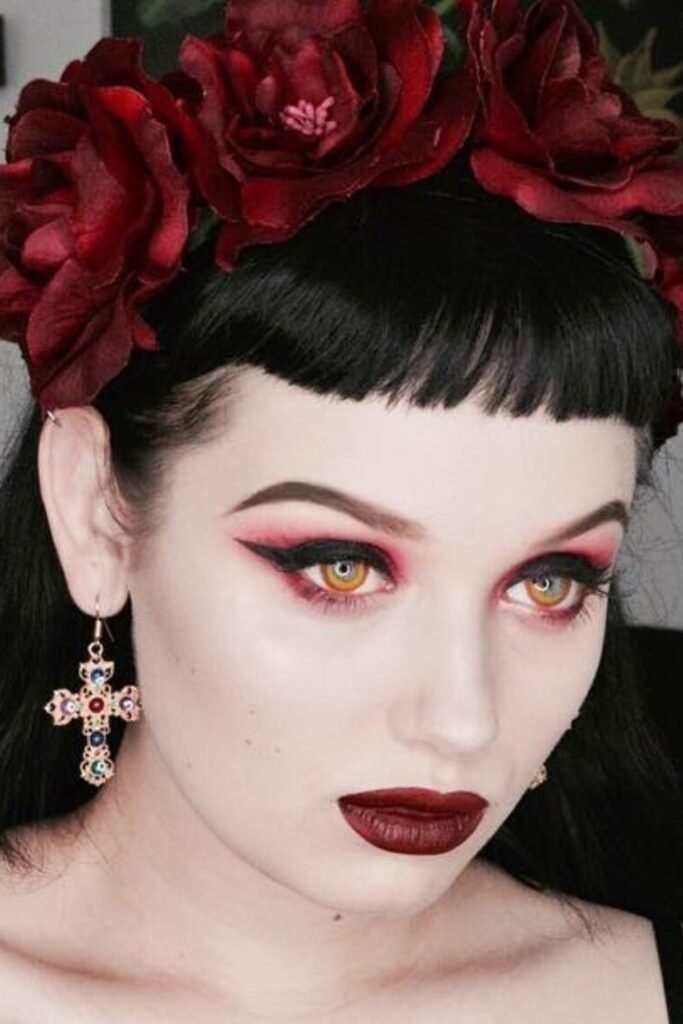 This look adds warmth to classic goth makeup. It suits brown and hazel eyes well.