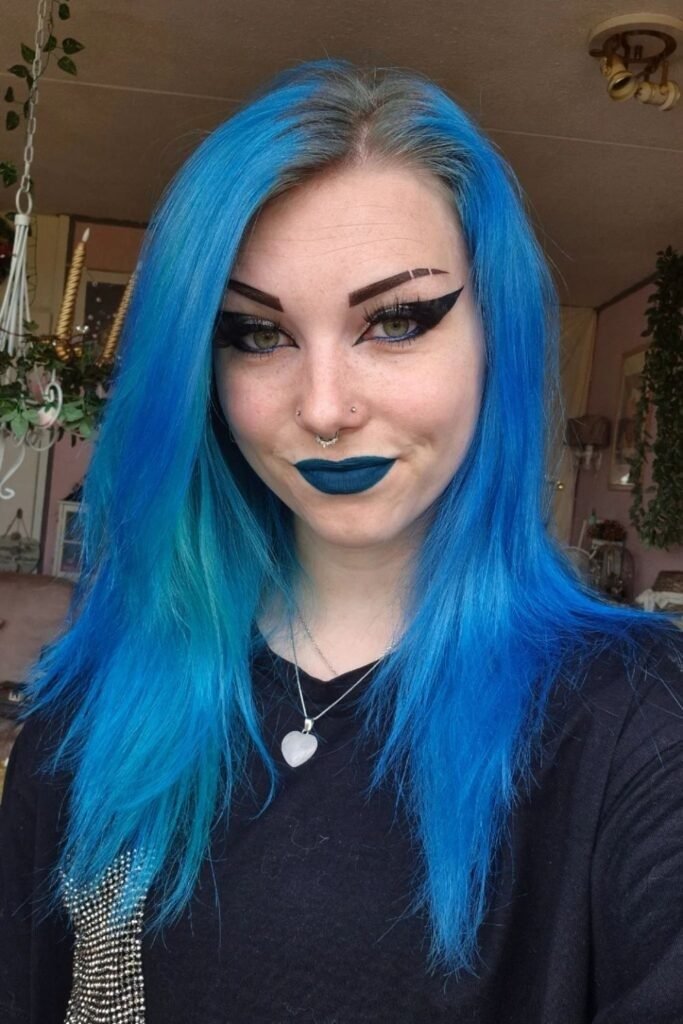 Blue adds cool depth. Pair with nude or soft plum lips.