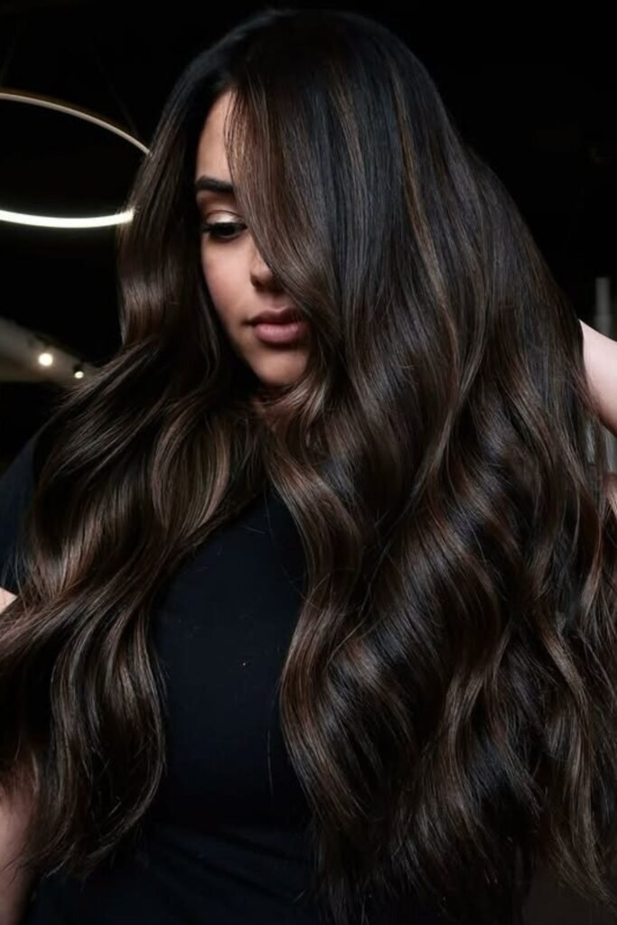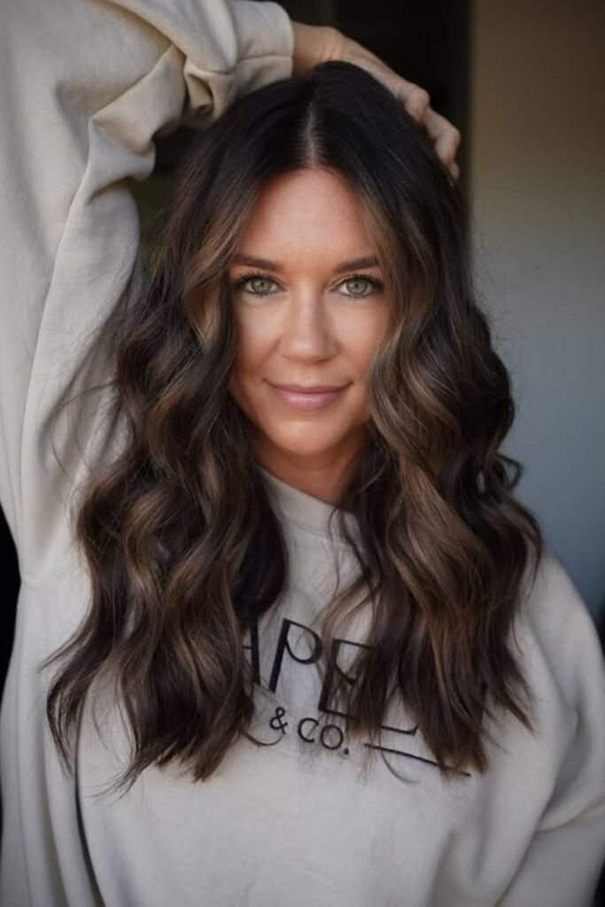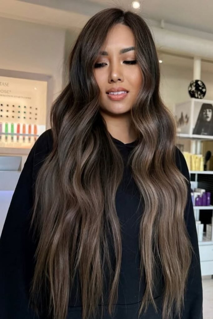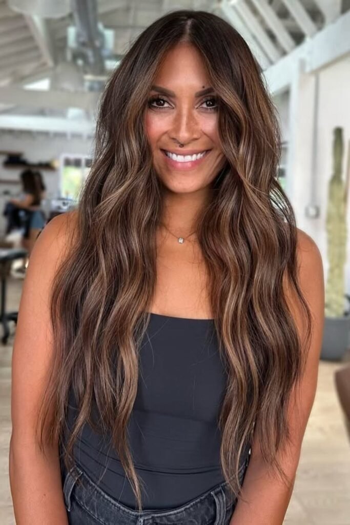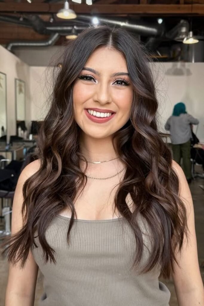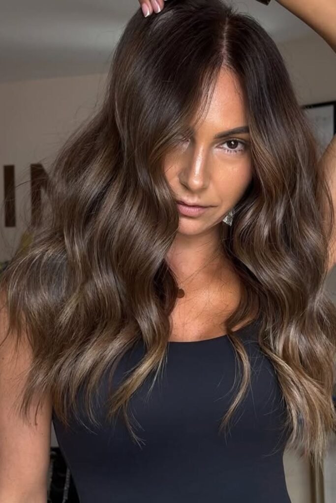 Smoky brunette waves use muted tones that soften the overall look. This color feels calm and modern. It works best on wavy or layered hair where the smoky tones can blend naturally.