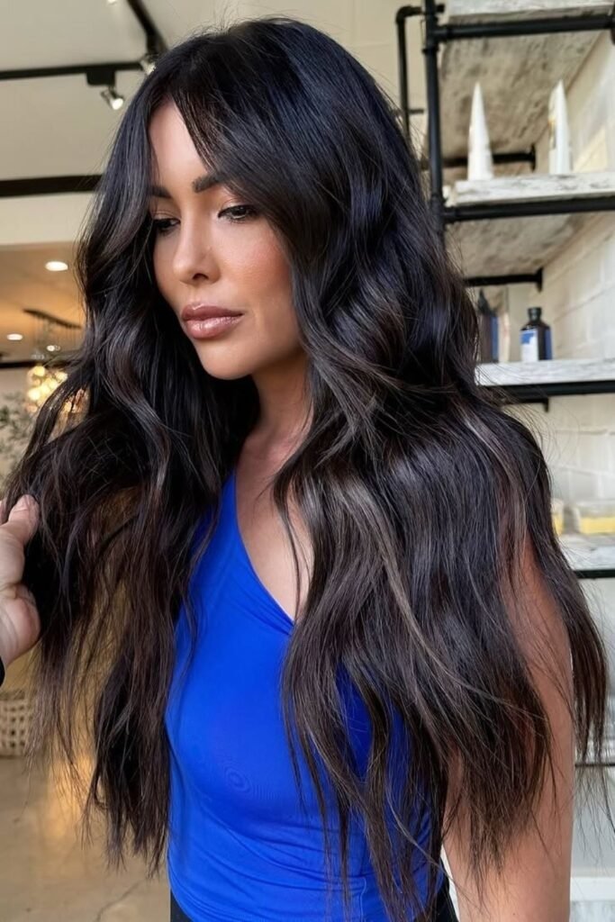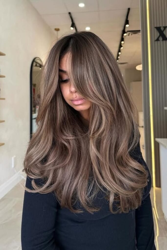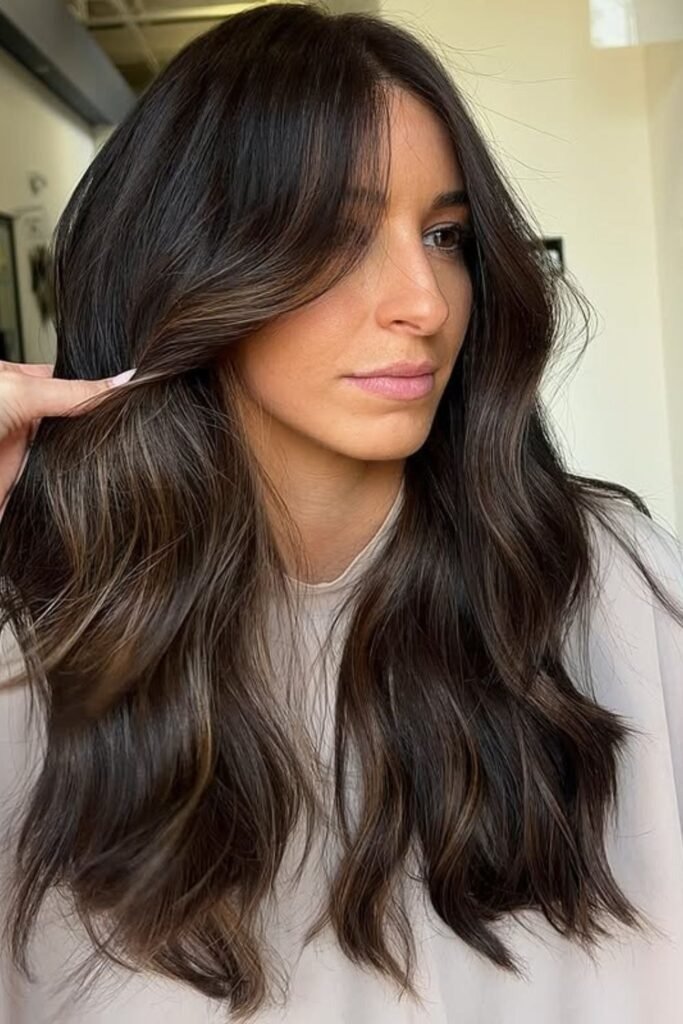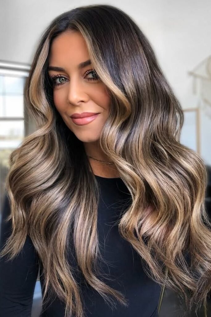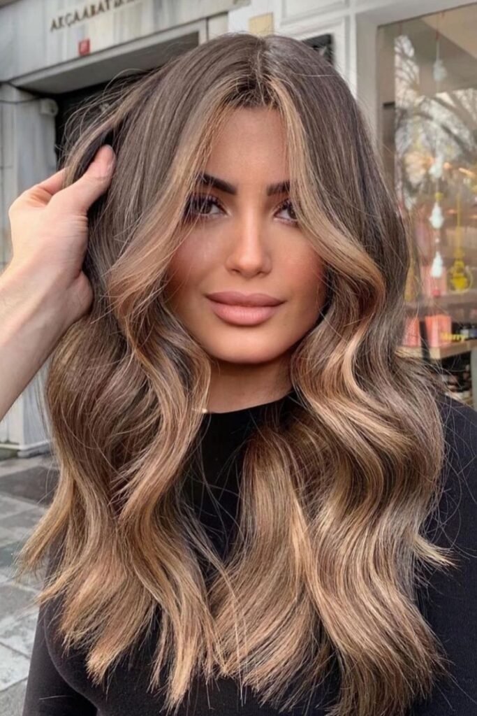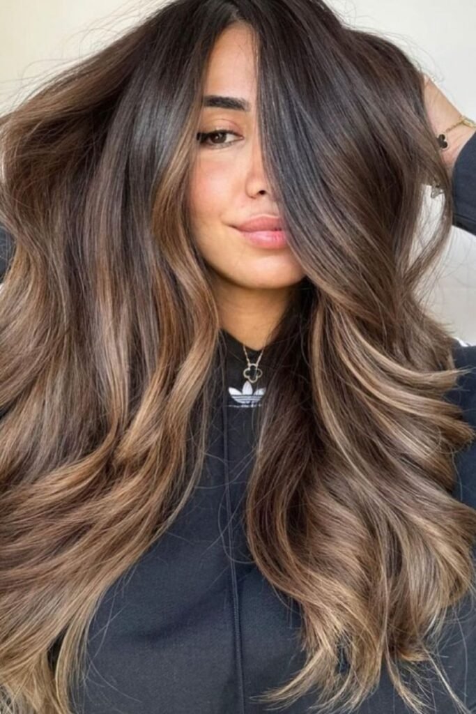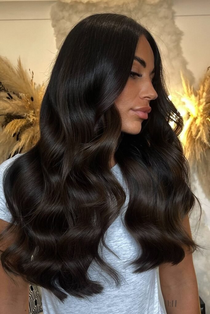 Smoky brunette waves use muted tones that soften the overall look. This color feels calm and modern. It works best on wavy or layered hair where the smoky tones can blend naturally.