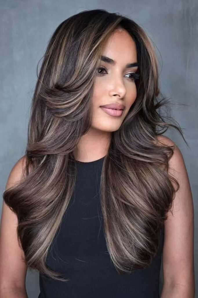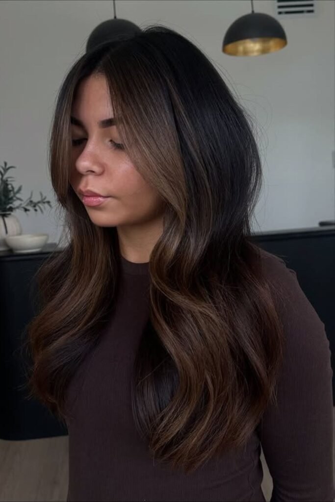 Chocolate root melt keeps the roots deep while blending lighter tones toward the ends. This method reduces harsh regrowth lines and keeps maintenance low. It is ideal for brunettes who want a natural transition.
