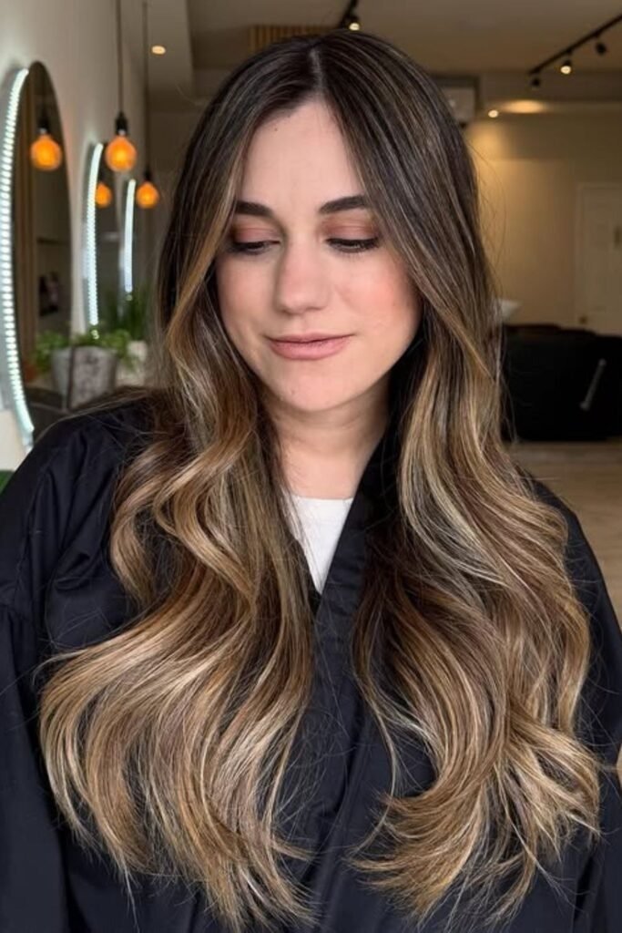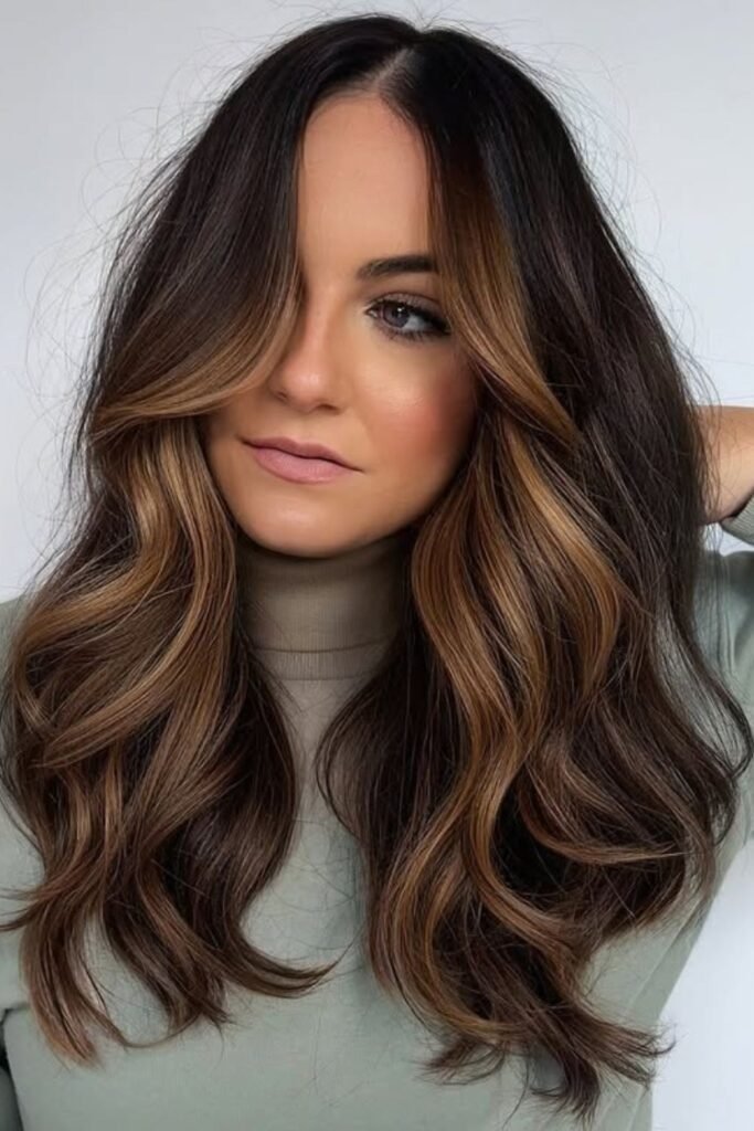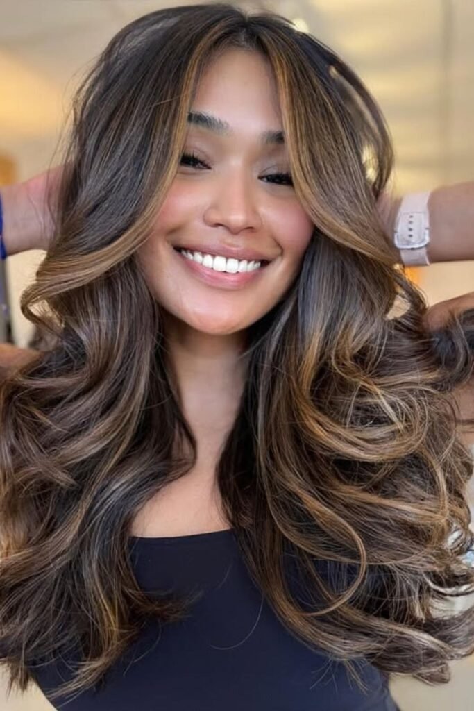 Caramel ribbon brunette adds soft lightness through the mid-lengths and ends. The ribbons of color are placed gently so they blend into the darker base. This style gives movement to the hair and helps waves or curls stand out without harsh contrast. It works well for medium to long hair and grows out smoothly.
