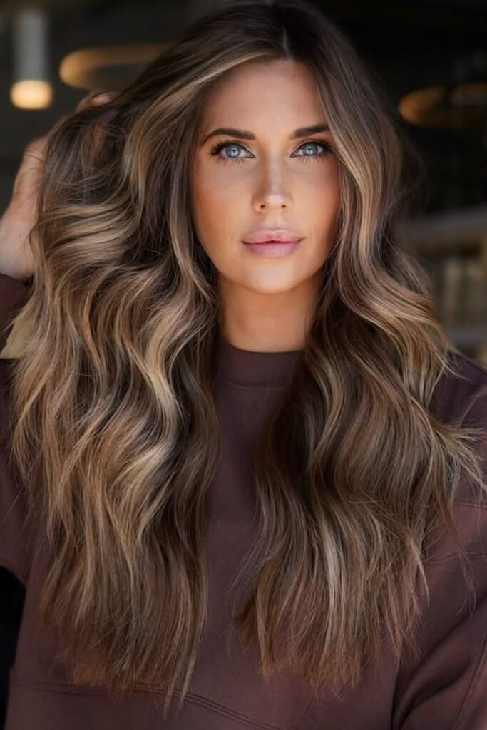Mocha brown waves enhance depth and shine. The mocha tone adds richness while keeping the color soft. This shade looks best on wavy hair where the movement shows off the dimension.