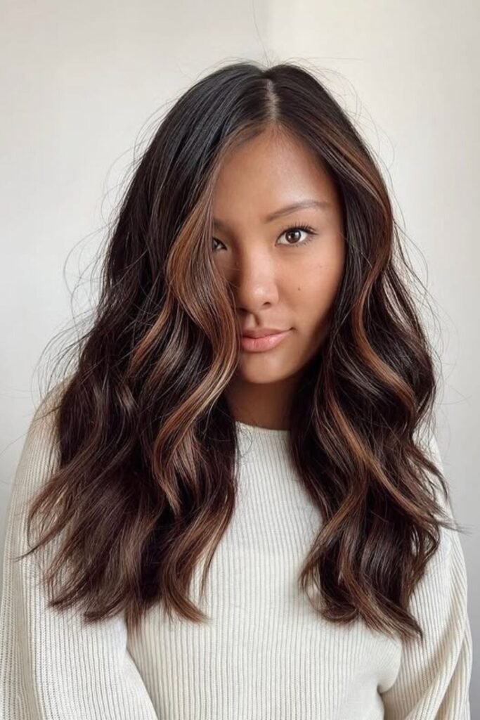 Copper brown highlights add gentle warmth to brunette hair. The copper tones are soft and blended, not bold. This color works well for brunettes who want warmth without going red.