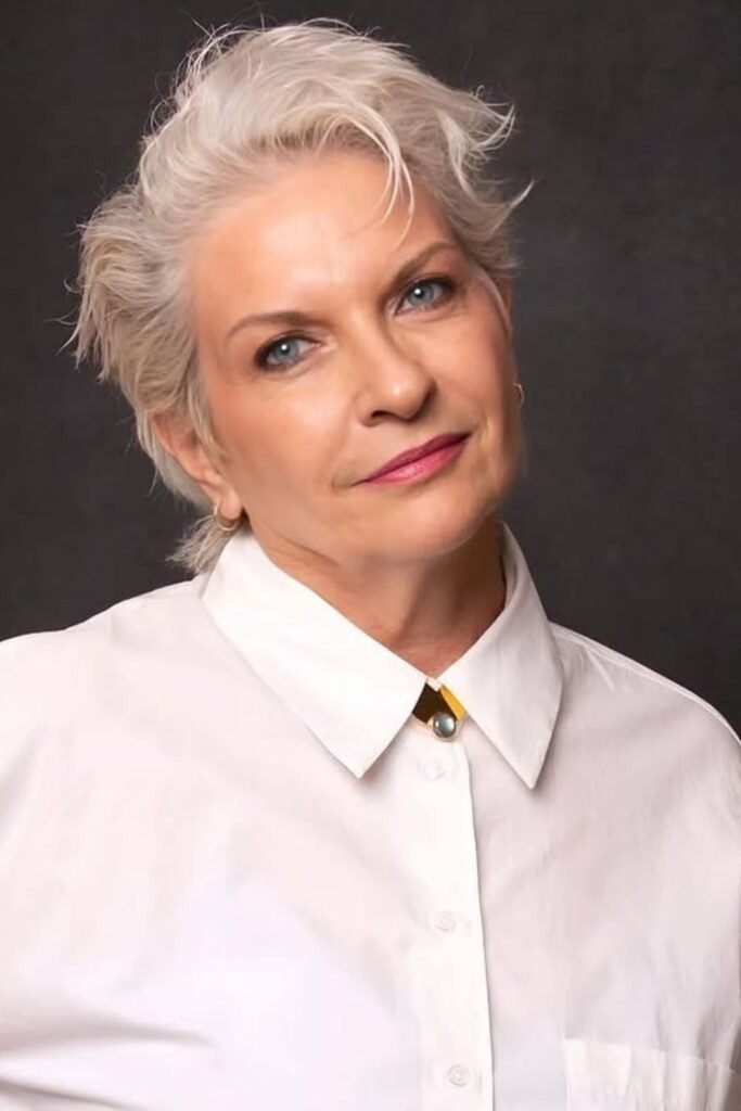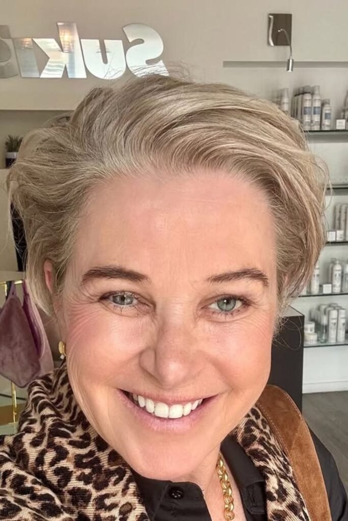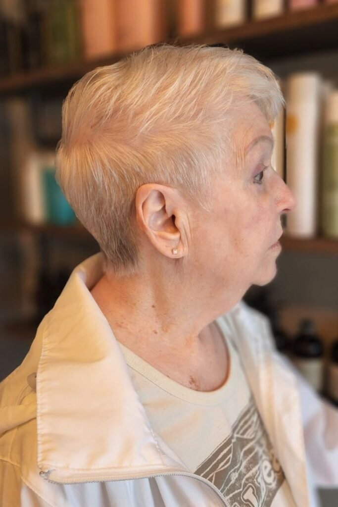 The soft layered pixie is a favorite because it works with fine and thinning hair. This haircut keeps the sides and back neat while leaving gentle layers on top. These layers create light volume without teasing or heavy styling. The shape frames the face softly, which helps reduce sharp lines around the eyes and mouth.