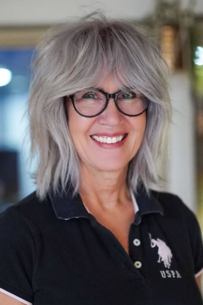The feathered texture helps gray hair look brighter and less dull. It also grows out nicely, which means fewer salon visits.